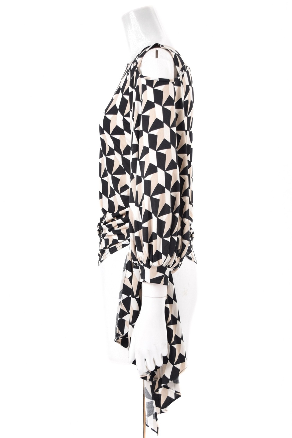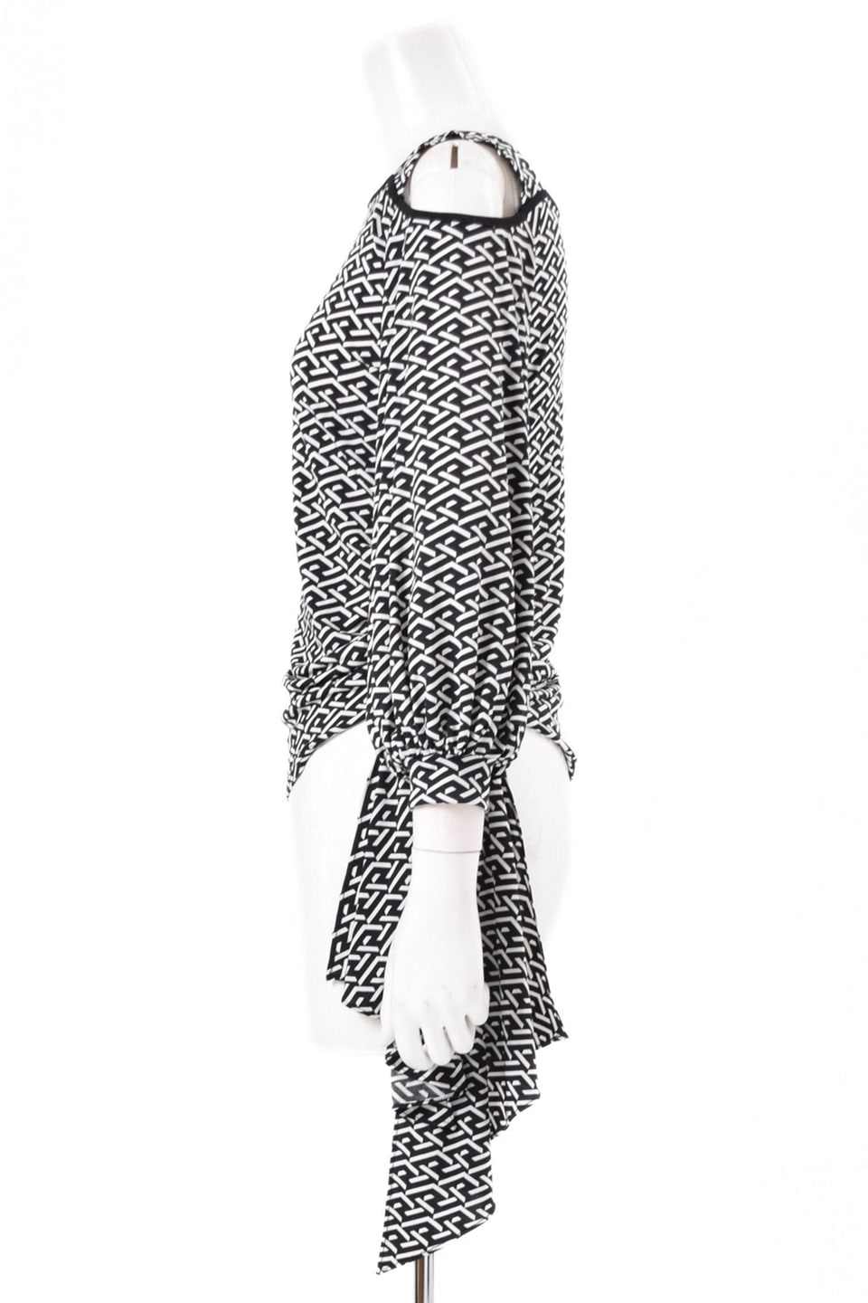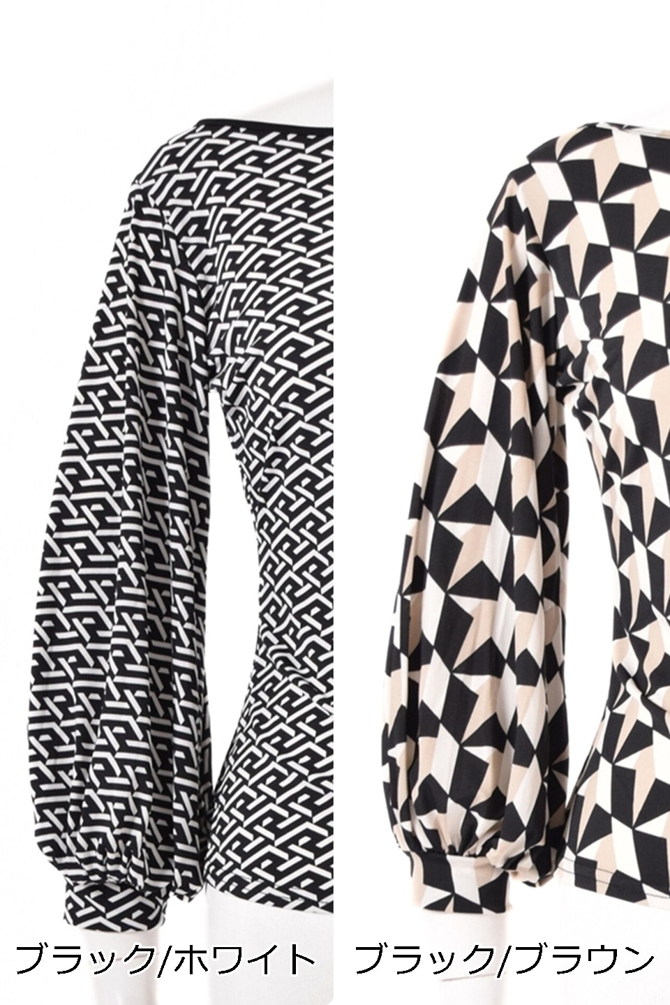 左肩のオフショルダーは総柄の重さを軽くしてくれます。