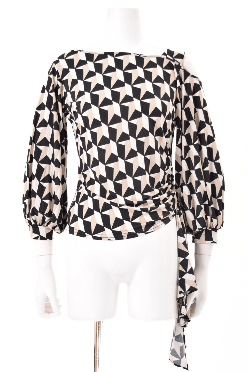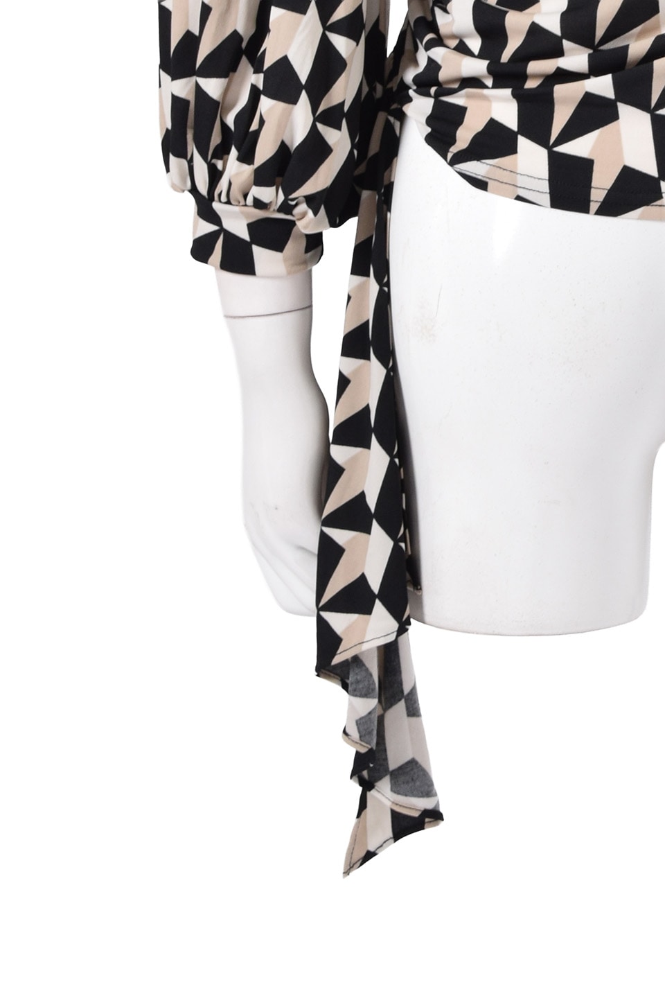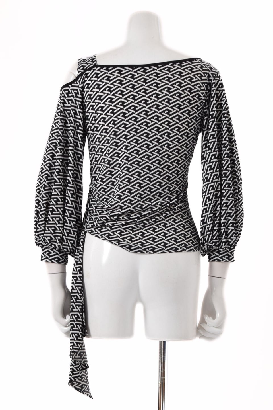 左肩のオフショルダーは総柄の重さを軽くしてくれます。