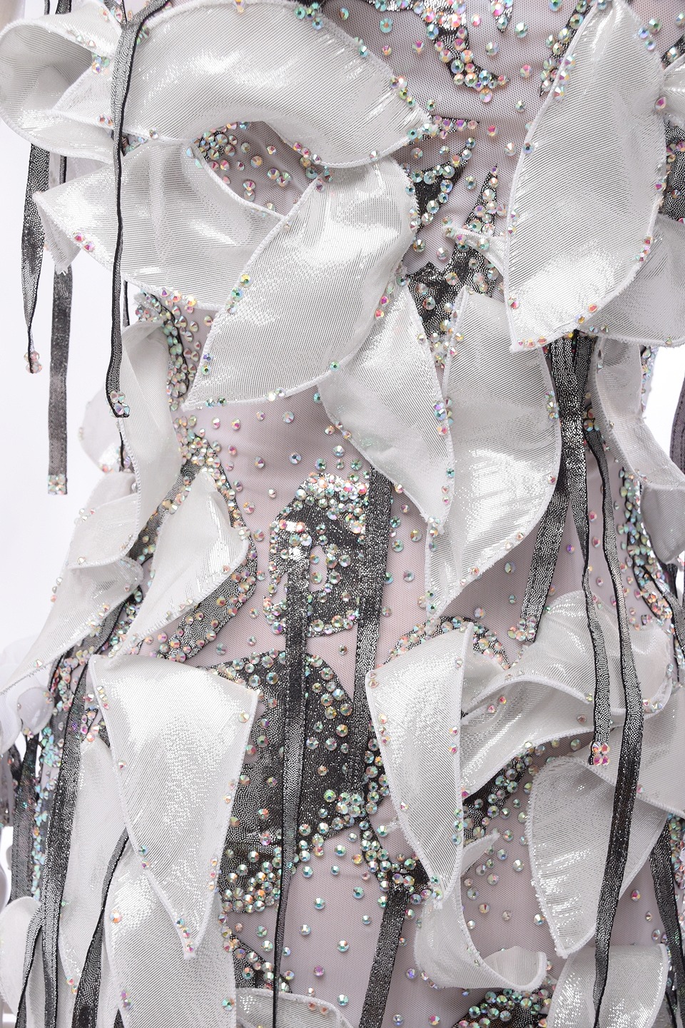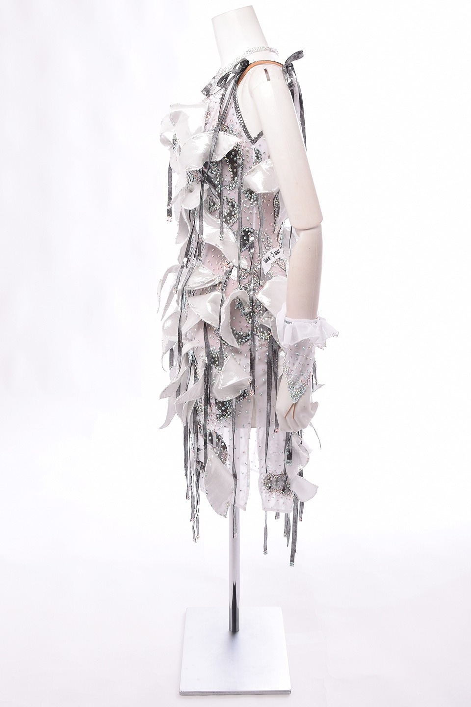 ボディ全体ストレッチネットのワンピースに立体の花びらを施し、動きを出したファッショナブルなドレス。